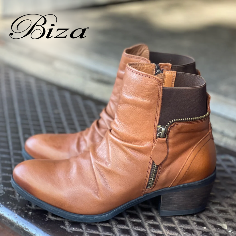 Crafted with premium leather uppers and a comfortable stacked heel, the Vivien by Biza Shoes combines fashion and function for all day wear. This stylish western-inspired pleated boot features a convenient interior side zip for easy wearability. The leather lined cushioned insole and durable rubber outsole ensure superior comfort and support with every stylish step.
